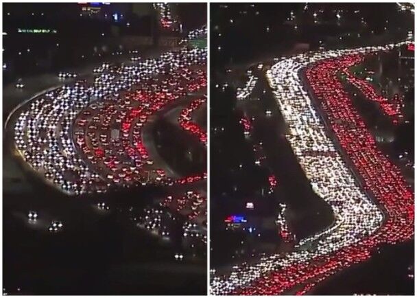 大批美國(guó)民眾在感恩節(jié)提早返回家鄉(xiāng),計(jì)劃與家人迎接這個(gè)節(jié)日。但過(guò)多的人流導(dǎo)致交通嚴(yán)重堵塞,洛杉磯的公路更出現(xiàn)超長(zhǎng)車龍,如河流般的紅白車燈更成為一道奇景。