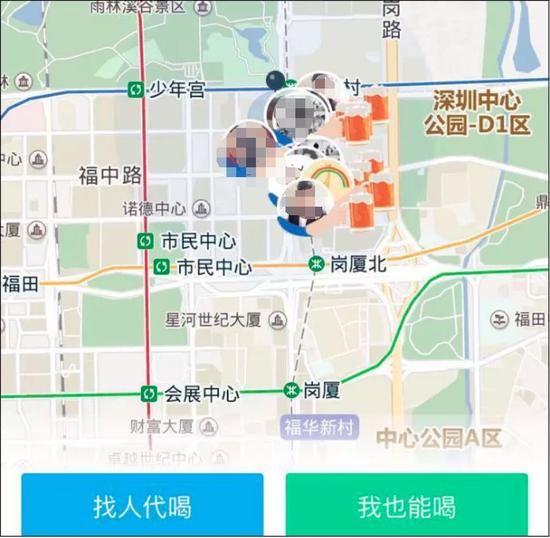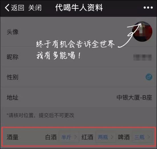 用戶在軟件中輸入或設(shè)置自己的位置,手機(jī)畫面的地圖上就會(huì)顯示出附近的 “代喝人”。這些“代喝人”在提供“代喝”服務(wù)之前,會(huì)提前在軟件上的個(gè)人信息中寫明自己的酒量、喜歡的酒類以及性別等基本信息。無論是誰都可以成為代喝人。