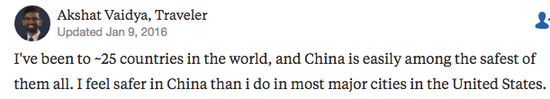 當(dāng)然,在中國(guó)旅游對(duì)老外的吸引力不只是便捷。一位去過(guò)全世界二十多個(gè)國(guó)家的外國(guó)驢友總結(jié)說(shuō),“中國(guó)是我去過(guò)的最安全的國(guó)家之一。我感覺(jué)在中國(guó)的大型城市比在美國(guó)安全多了?!?/p>