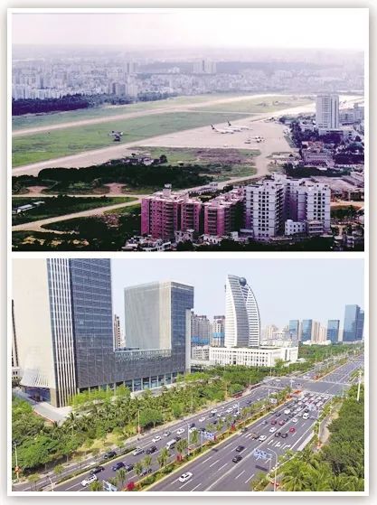 拼版照片為??谑袊d大道,曾經(jīng)是??诖笥⑸綑C場(上圖為1999年5月新華社記者姜恩宇攝,下圖為2018年4月14日新華社記者郭程攝)。 新華社發(fā)