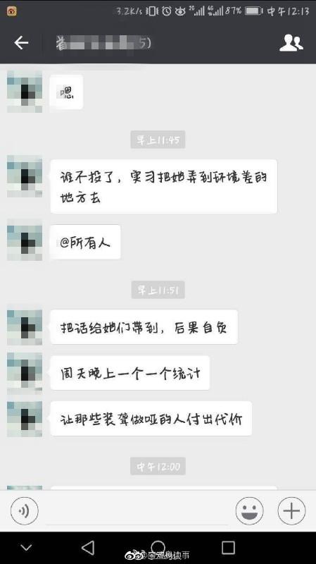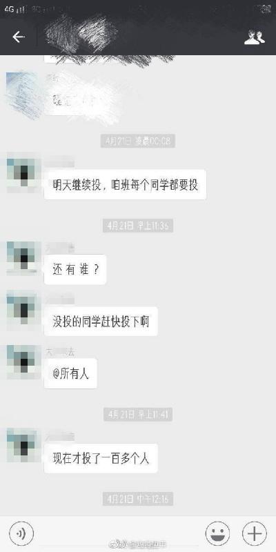 該網(wǎng)友提供的聊天截圖顯示,一個昵稱叫“大江東去”的人4月21日在班級微信群中說“明天繼續(xù)投,咱班每個同學都要投”“沒投的同學趕快投下”“現(xiàn)在才投了一百多個人”。在另一個名叫“首腦交流群”的微信群中,“大江東去”對班干部說:“誰不投了,實習把她弄到環(huán)境差的地方去”“把話給她們帶到,后果自負”“周天晚上一個一個統(tǒng)計”“讓那些裝聾作啞的人付出代價”。