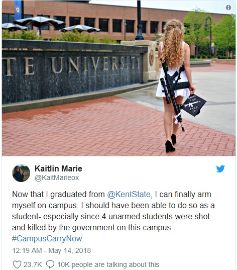 報(bào)道稱,凱特琳·班內(nèi)特畢業(yè)于位于俄亥俄州的州立肯特大學(xué),取得了生物學(xué)學(xué)位。畢業(yè)后的第二天,這名22歲的女孩返回校園,肩背一把AR-10半自動(dòng)步槍,手拿頂上印有“有膽來拿”字樣(美國獨(dú)立戰(zhàn)爭的口號(hào))的畢業(yè)帽,還拍了照并發(fā)到了網(wǎng)上。