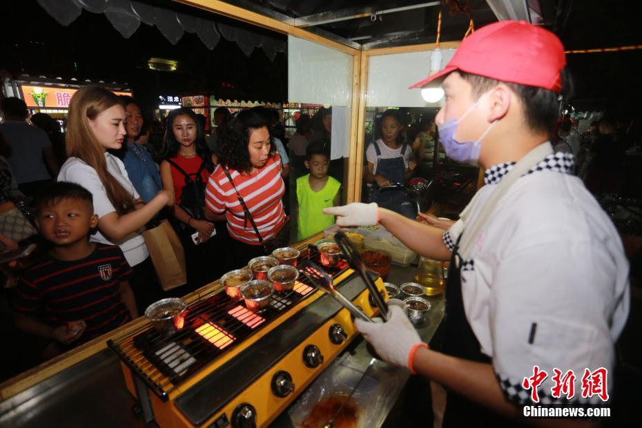 9月17日,顧客排隊(duì)在購(gòu)買(mǎi)“烤腦花”。在掌握了技能后于6月初回到家鄉(xiāng)河南漯河市文化路夜市開(kāi)起了漯河首家“不靠譜烤腦花”。