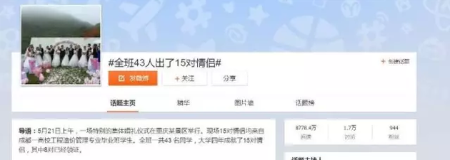 這條消息,最早出現(xiàn)在5月21日的微博和各大網(wǎng)站上,“全班一共43人,大學(xué)四年成就了15對情侶,畢業(yè)之際在重慶某景區(qū)舉辦集體婚禮?!本W(wǎng)友直呼:這簡直不可思議。