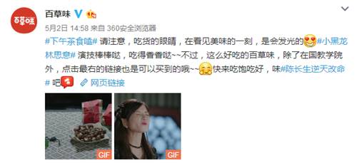 當(dāng)大多數(shù)品牌滿足于在電視劇中露下臉的時候,百草味已經(jīng)開始融入劇情。令人驚訝的是,露臉的惹人嫌,大篇幅講述“名字來源”的百草味,竟然收獲一眾好評。