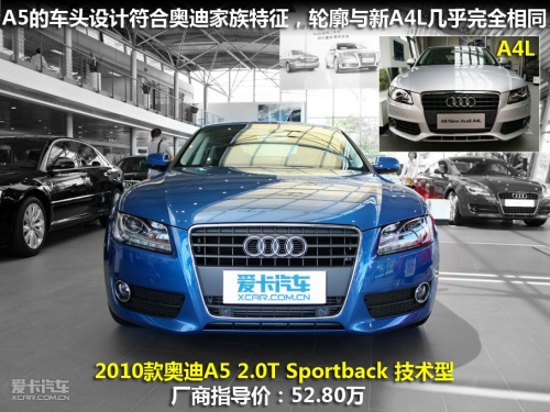 如果不仔細看,你將很難把它和新A4L區(qū)分開,它的車頭部造型幾乎與A4L完全相同,車身尾部也僅僅是尾燈與A4L略微不同。如果不是尾部的A5字樣標識,很多人都可能會“看花眼”。事實上,奧迪A5 Sportback的車身尺寸也與歐版奧迪A4較為接近。