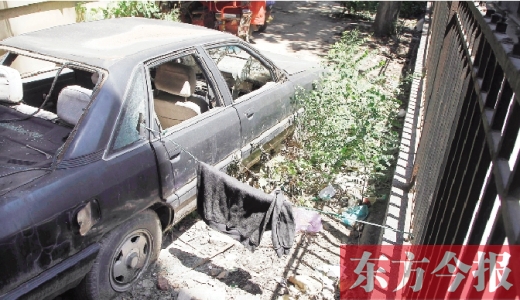 在采訪中得知,國棉三廠綠化街也有一輛“僵尸車”。東方今報記者在現(xiàn)場看到,這是一輛黑色馬自達轎車,經(jīng)過長時間的風(fēng)吹雨打,油箱蓋、雨刮器、車頭銹跡斑斑,車頂凹陷,引擎蓋上放著一塊磚,同樣沒有車牌號。