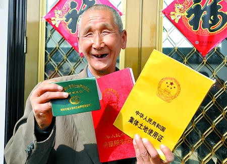4月6日,舞鋼市尹集鎮(zhèn)張莊新型農(nóng)村社區(qū)農(nóng)民邱建功領(lǐng)到房屋所有權(quán)證和集體土地使用證后喜笑顏開(kāi)。