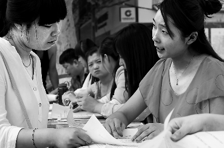 這也表現(xiàn)在當(dāng)天的招聘活動(dòng)上。在當(dāng)天活動(dòng)的鄭州主會(huì)場,即將大專畢業(yè)的朱康想找一份圖文設(shè)計(jì)的工作,這和她的專業(yè)對(duì)口?!巴﹄y找的,好多是話務(wù)員、銷售、傳菜員之類的技能性不高的工作。放棄專業(yè)去做其他的,感覺沒有優(yōu)勢(shì),未來發(fā)展空間也不大?!敝炜嫡f。