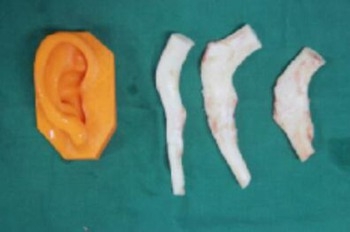 一期擴張順利,1月5日進行的是二期取肋軟骨再造耳廓的手術。術中引入3D打印輔助技術,吳主任根據3D技術打印出來的耳廓模型進行精細雕刻,雕刻的耳廓外形美觀、逼真,將成形的耳廓植入擴張的皮膚內,術后效果良好。