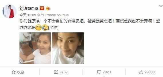 近期,劉濤在微博上面曬出了兩張照片,附文“你們就原諒一個不會自拍的女演員吧、臉黃就黃點吧!畫質(zhì)差我也不會弄啊!愛咋咋地吧”!