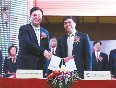 6月8日,中國(guó)中車(chē)股份有限公司副董事長(zhǎng)劉化龍(左)與上海證券交易所副總經(jīng)理徐明簽訂《上市協(xié)議書(shū)》。當(dāng)日,中國(guó)中車(chē)在上交所鳴鑼上市。