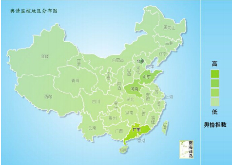 下圖為輿情監(jiān)控地區(qū)分布圖,大象輿情研究院通過對此事件相關(guān)報道網(wǎng)站ICP監(jiān)管所屬地區(qū)的挖掘分析,廣東媒體的傳播活躍度最高,這與廣東地區(qū)歷來開風(fēng)氣之先、敢作敢為的特征相吻合;其次是 北京、山東、河南的媒體。