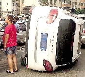 昨日清晨7時(shí)許,在桐柏路航海路南300米帝湖小區(qū)西門,發(fā)生驚險(xiǎn)一幕,一輛保時(shí)捷越野車從地下車庫(kù)躥出后,女司機(jī)錯(cuò)把油門當(dāng)剎車,重傷1人,傷4輛車,因?yàn)檐囁俑?,保時(shí)捷竟彈起爬上另一輛轎車上,最終側(cè)翻后停下。