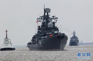 當日,參加中俄“海上聯(lián)合—2014”軍事演習的俄方艦艇陸續(xù)駛抵上海某軍港。中俄兩國海軍互鳴禮炮,中方為來訪的俄艦舉行隆重歡迎儀式。俄羅斯太平洋艦隊旗艦“瓦良格”號導(dǎo)彈巡洋艦駛?cè)胲姼蹠r,參加歡迎儀式的軍樂隊奏響歡迎曲。隨后,“快速”號驅(qū)逐艦、“潘捷列耶夫海軍上將”號大型反潛艦、“伊利姆”號中型海洋油船、“涅維爾斯科伊海軍上將”號大型登陸艦,“卡拉爾”號海洋拖船陸續(xù)駛?cè)敫劭?。這次聯(lián)合軍事演習,中俄海軍都派出了主戰(zhàn)艦艇參加。中方參演兵力包括導(dǎo)彈驅(qū)逐艦、導(dǎo)彈護衛(wèi)艦、綜合補給艦以及導(dǎo)彈艇等水面艦艇8艘、潛艇2艘、固定翼飛機9架。俄方參演兵力包括巡洋艦、反潛艦、驅(qū)逐艦、登陸艦、油船和海洋拖船等水面艦艇6艘。此外,為執(zhí)行海上聯(lián)合解救被劫持船只、護航等特殊任務(wù),雙方還派出艦載直升機、特戰(zhàn)分隊等兵力參加此次演習。新華社記者 查春明攝