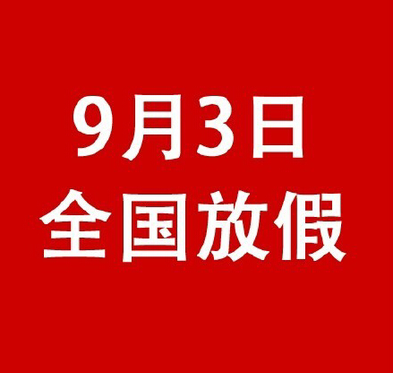 國務(wù)院發(fā)通知:中國人民抗日戰(zhàn)爭暨世界反法西斯戰(zhàn)爭勝利70周年紀念日(9月3日)放假一天!為方便公眾安排假日期間生產(chǎn)生活,特作如下調(diào)休:9月3日至5日調(diào)休放假,共3天。其中9月3日(星期四)放假,9月4日(星期五)調(diào)休,9月6日(星期日)上班。