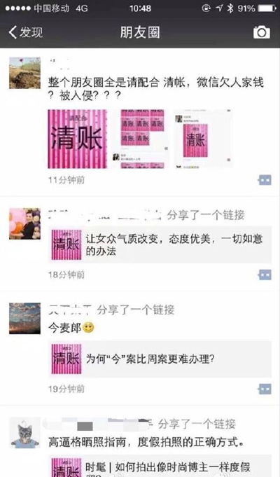 上午十點半左右,不少微信用戶反映其朋友圈被“請配合清帳”刷屏(如圖)。騰訊回應(yīng)稱:已確認是由于少部分服務(wù)器上午升級導致短暫不穩(wěn)定,持續(xù)時間大約5分鐘?,F(xiàn)在已經(jīng)恢復,主要受影響的是廣東聯(lián)通用戶。