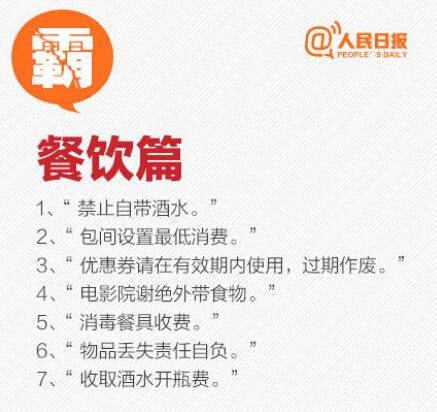 消協(xié)指出,影院禁帶食品屬霸王條款?!安蛷d禁止自帶酒水”“包間最低消費(fèi)xx元”“一經(jīng)售出,概不退換”“本方擁有最終解釋權(quán)”“物品丟失本店概不負(fù)責(zé)”……熟悉吧?都是霸王條款!如果遇到,果斷打12315投訴,再不忍氣吞聲!為自己擴(kuò)散