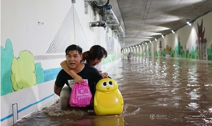 13、浙江金華橋洞積水 男子馱妻女淌水趕高鐵