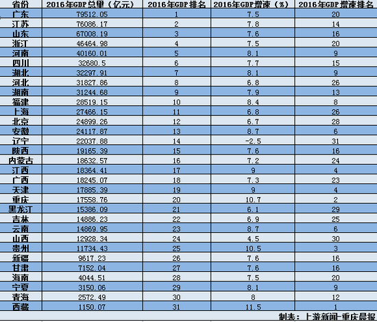 隨著2月19日海南省兩會(huì)開幕,地方兩會(huì)時(shí)間進(jìn)入尾聲,2016年各地GDP數(shù)據(jù)也已全部出爐。上游新聞-重慶晨報(bào)記者根據(jù)各地政府工作報(bào)告和統(tǒng)計(jì)部門數(shù)據(jù)發(fā)現(xiàn),GDP總量達(dá)到3萬(wàn)億元以上的省份增至9個(gè)。