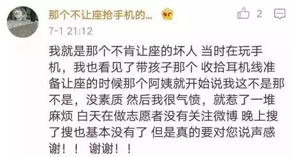 7月1日,該男子發(fā)微博稱,他原本收拾耳機(jī)準(zhǔn)備讓座的,這時(shí)大媽就開始說他這不是那不是,說得他很氣憤,就賭氣不讓了。