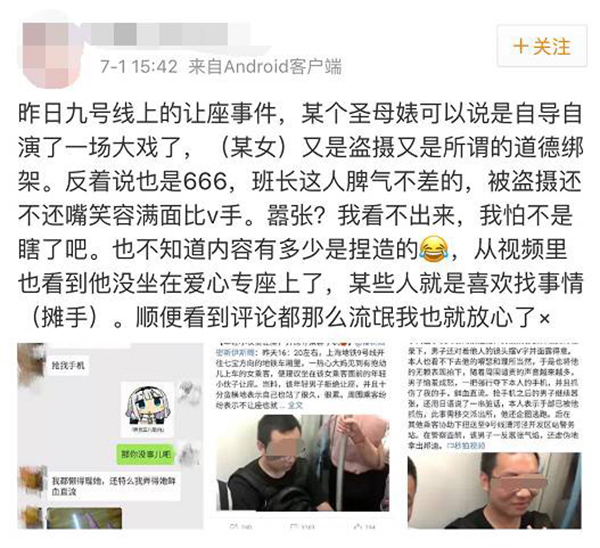 1. 我當(dāng)時(shí)就在這節(jié)車廂里,大媽自始至終都是在好好跟他商量,讓座給另一個(gè)抱娃的,這小伙子根本沒有讓出來的意思。這也罷了,畢竟正如他后來自己所說,沒有法律規(guī)定必須讓座。但后來他反而拿手機(jī)拍大媽,周圍好幾個(gè)乘客看不下去也拿手機(jī)反拍他。一開始他還很得瑟對(duì)鏡頭做勝利的手勢,后來突然搶了對(duì)面妹子的手機(jī),還抓傷了對(duì)方。被幾個(gè)男士按倒之后說了一串外語,其中聽到了罵人的話。