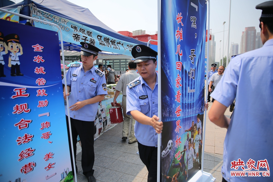 7月2日上午,鄭州市紫荊山地鐵站出入口,執(zhí)法人員抬著寫有勸導(dǎo)語的宣傳板,前往占道經(jīng)營攤位“圍觀執(zhí)法”。
