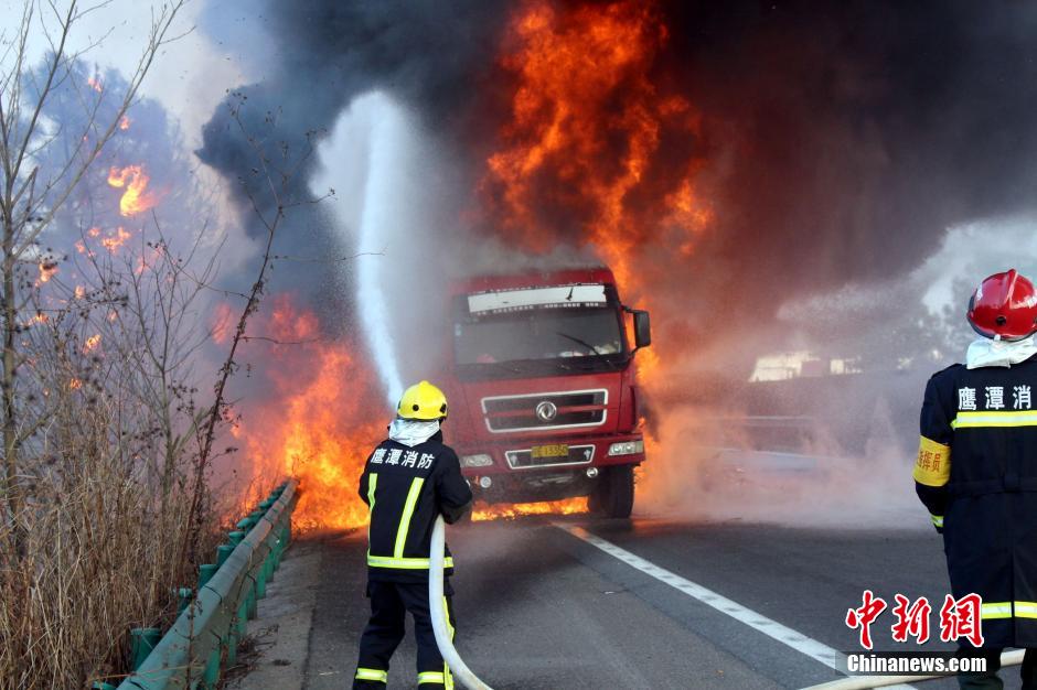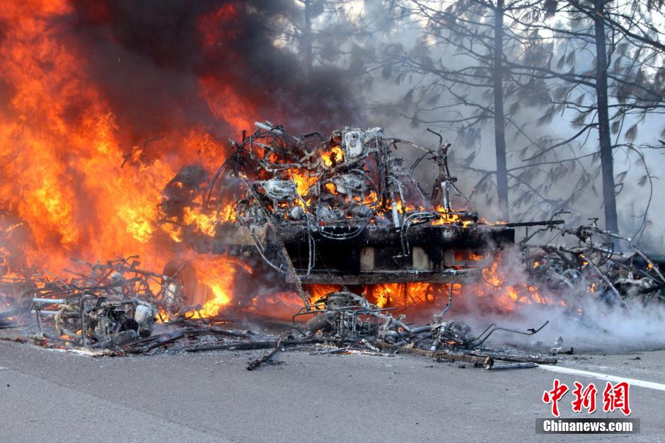 1月23日下午4時(shí)許,滬昆高速公路江西弋陽(yáng)往貴溪方向593公樁(貴溪收費(fèi)站附近)一輛載有133部電動(dòng)車的半掛車起火,導(dǎo)致電動(dòng)車被大火“吞噬”。江西貴溪消防官兵接警后迅速到場(chǎng)撲救,半小時(shí)后將大火撲滅。據(jù)司機(jī)稱,火災(zāi)疑因高速護(hù)坡雜草叢起火產(chǎn)生的火芯飄至半掛車,引燃包裝電動(dòng)車的紙殼箱所致。中新社發(fā) 龔武 攝