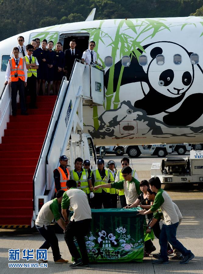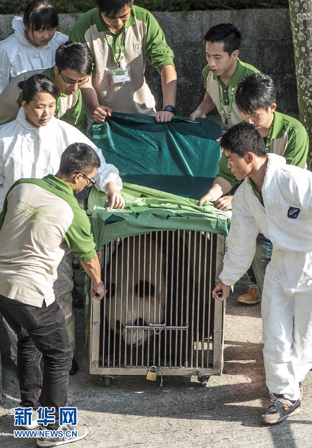 4月30日,工作人員將大熊貓運送到澳門路環(huán)金像農(nóng)場的隔離設(shè)施地點。當(dāng)日16時許,中央政府贈送澳門的新一對大熊貓運抵澳門,澳門特區(qū)政府行政法務(wù)司司長陳海帆等官員及部分少年兒童在機場迎接。大熊貓經(jīng)檢疫人員檢查后在運輸籠中向前來接機的人們短暫亮相。目前它們身體狀況良好,隨后將前往金像農(nóng)場進(jìn)行30天隔離檢疫。新華社記者張金加攝