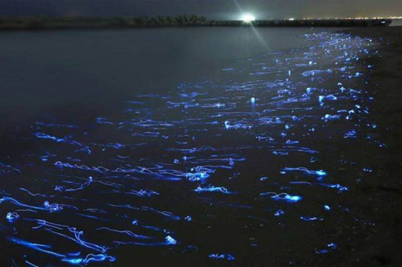 據(jù)美國Odditycentral網(wǎng)站6月24日報道,每年3月至6月,全長14公里的日本富山灣海岸線會被熒光閃閃的藍光點亮,既漂亮又壯觀。然而,這一奇觀并不是人為制造,而是一種自然現(xiàn)象,是由不計其數(shù)的熒光烏賊形成的。