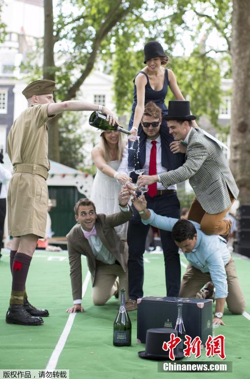 當(dāng)?shù)貢r間2015年7月11日,英國倫敦,貝德福德廣場花園舉辦一年一度的“紳士運動會”。這是一個不以打破記錄為榮,而專為紳士打扮裝帥耍酷而設(shè)的趣味運動會,比賽項目包括“雨傘騎(車)斗”、“燙衣板沖浪”、“背人賽跑”等,現(xiàn)場參加者不一定會出汗出力,但一定要打扮成傳統(tǒng)紳士淑女風(fēng)格,而叼煙、小酌一杯的鏡頭更讓人覺得這是一場嘉年華。