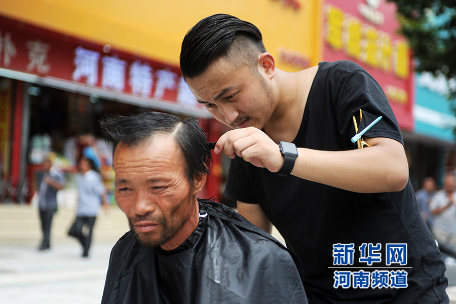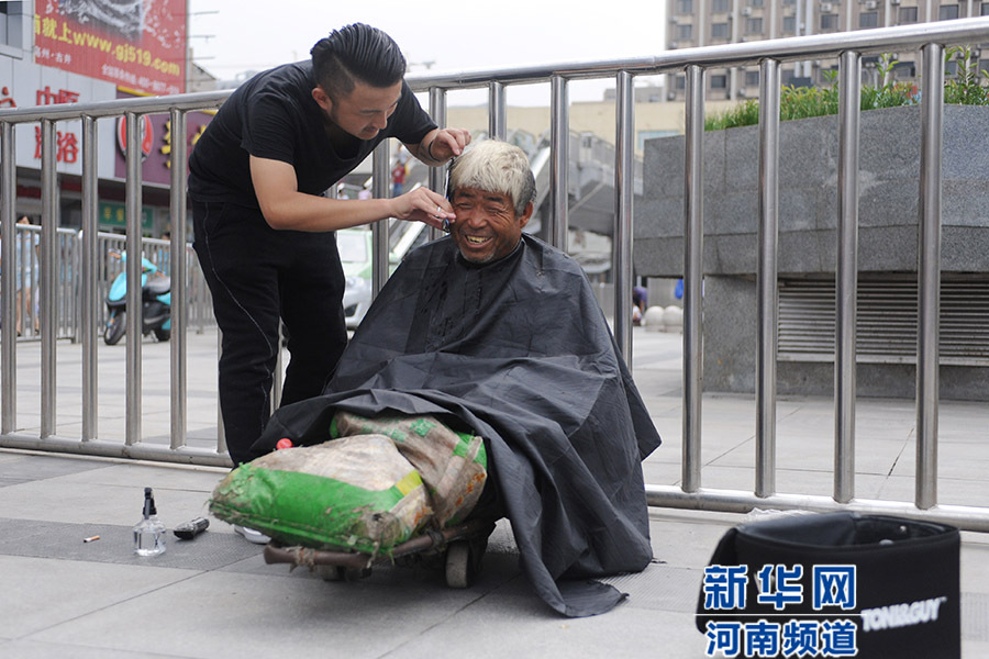 從7月21日開始,一位名叫紅濤的理發(fā)師每逢周二在鄭州街頭免費(fèi)為流浪人員理發(fā),他希望用此項(xiàng)行動呼吁大家關(guān)注街頭流浪人員群體。紅濤說,他還打算免費(fèi)為農(nóng)民工等群體理發(fā),讓他們感受到社會的溫暖。新華社發(fā)(馮大鵬 攝)