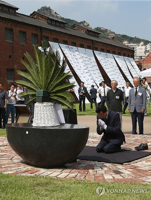 當?shù)貢r間2015年8月12日,正在韓國訪問的日本前首相鳩山由紀夫參觀了首爾“西大門刑務所”博物館,并在追悼碑前跪地禱告。據悉,西大門刑務所始建于1908年,用于關押反抗日本殖民統(tǒng)治的韓國抗日義士。鳩山由紀夫表示,日本理應承認殖民侵略歷史。(圖片來源:網絡)