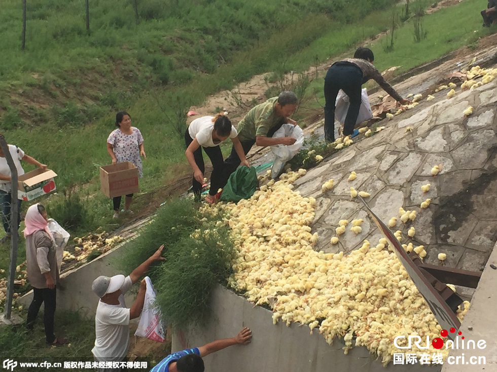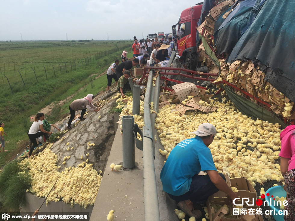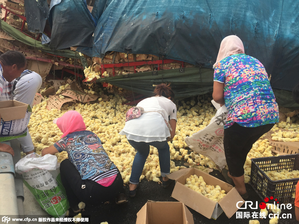 8月25日中午,山東榮烏高速濱州沾化區(qū)段,一輛山東禽類運(yùn)輸車輛傾翻,車上裝有數(shù)萬(wàn)只小雞。無(wú)數(shù)小雞散落在路上和高速護(hù)坡上,死的死傷的傷,大多數(shù)存活。