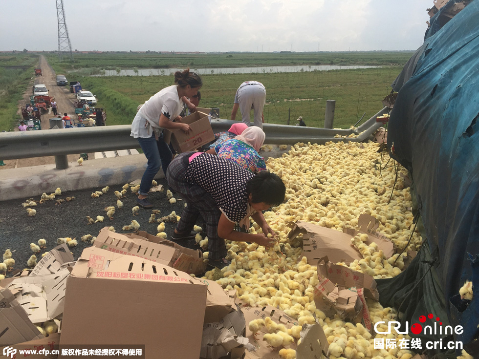 附近村民聞?dòng)?,紛紛?lái)抓小雞,不少人開著三輪車,成車裝回小雞。也有被堵在路上的人下車抓小雞?,F(xiàn)場(chǎng)警察無(wú)法制止,車主告訴記者,一車小雞價(jià)值五萬(wàn)元。