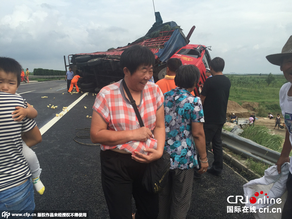山東榮烏高速濱州沾化區(qū)段,一輛山東禽類運(yùn)輸車傾翻,數(shù)萬(wàn)只小黃雞散落在地,附近村民聞?dòng)?,紛紛前?lái)抓小雞。圖片來(lái)源:CFP