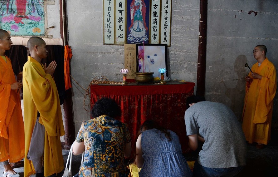 周近夏認(rèn)為,自己的服務(wù)理念賣的是火化之外的事情,追悼?jī)x式就是其中之一。從2011年成立釋友寵物殯葬至今,不少名人通過口口相傳找到周近夏的店為自己的寵物處理后事。圖為寵物狗的遺像被擺放在寺廟中。