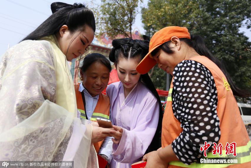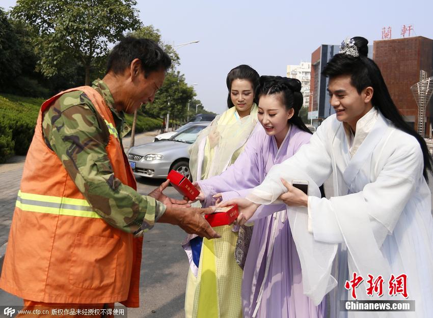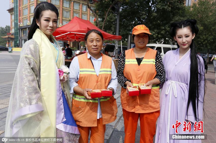 9月23日,河南鄭州古裝愛好者扮成“花千骨”走上街頭,為環(huán)衛(wèi)工人送月餅迎中秋。盧鍵 攝 圖片來源:CFP視覺中國