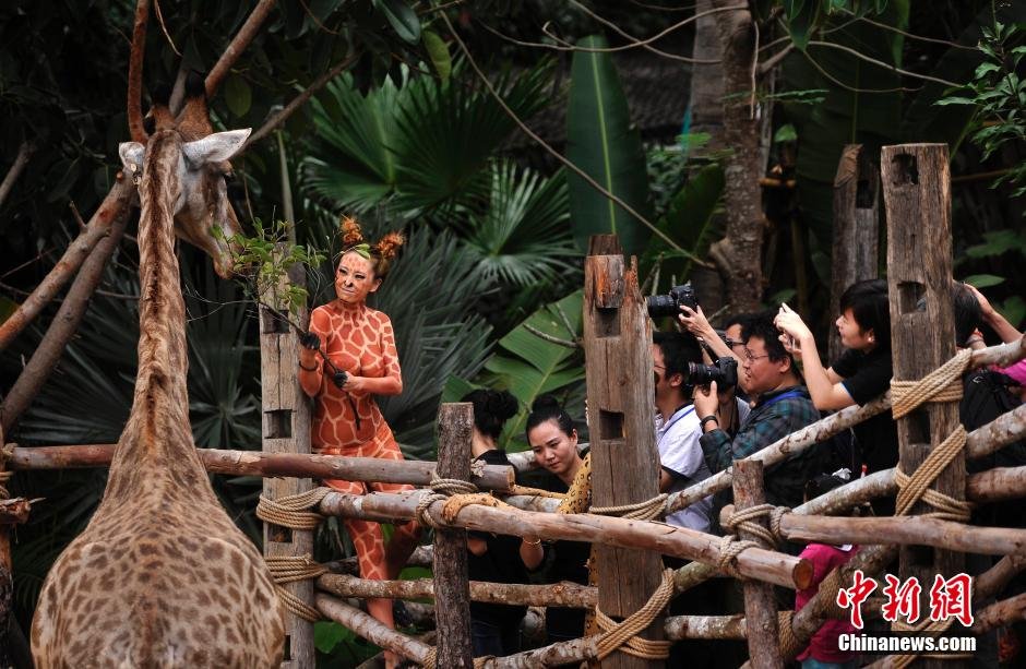 1月10日,三亞彩色動(dòng)物園上演了一場(chǎng)真實(shí)版“美女與野獸”,數(shù)10名美女通過(guò)人體彩繪裝扮成老虎、斑馬、豹子、長(zhǎng)頸鹿、孔雀、鸚鵡、火烈鳥(niǎo)等動(dòng)物,并與動(dòng)物園的野生動(dòng)物一起互動(dòng),吸引不少游客觀(guān)看。 陳超 攝
