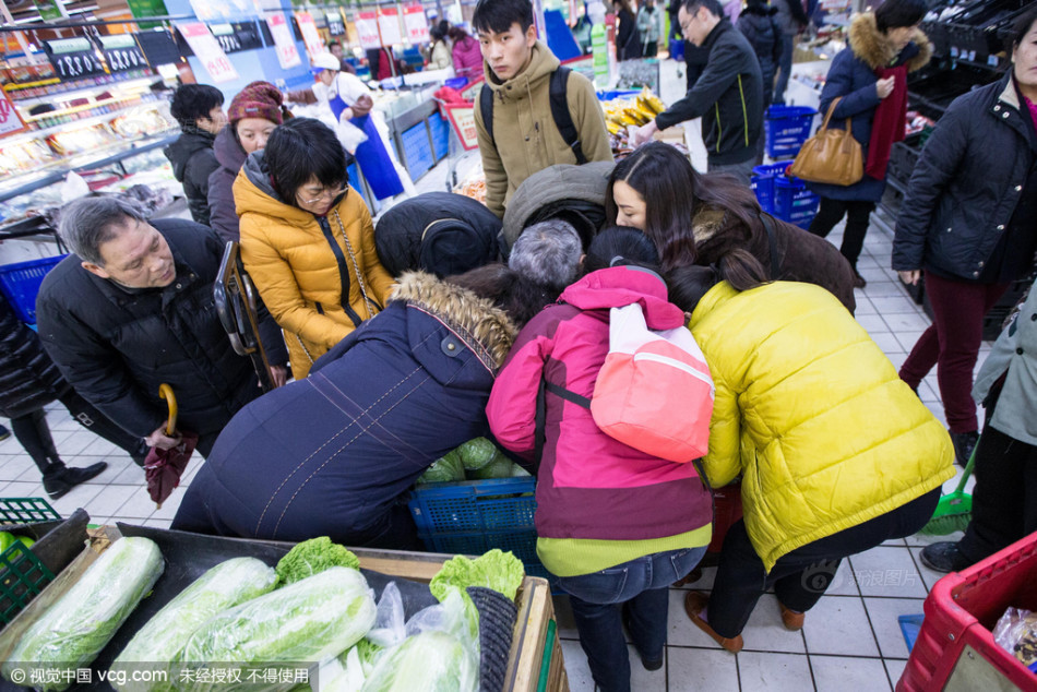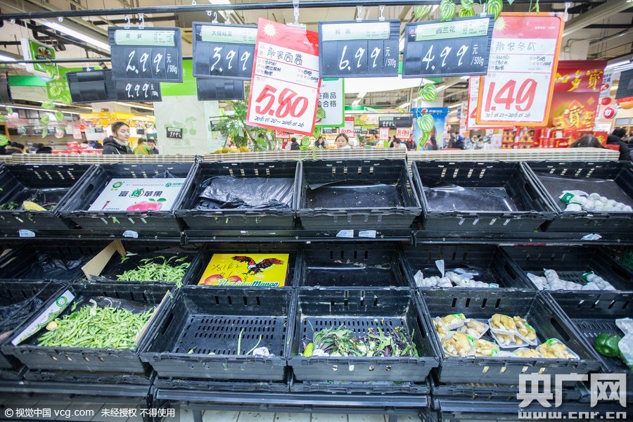 2016年1月20日,浙江省杭州市,杭州市氣象臺發(fā)布暴雪黃色預(yù)警信號。寒潮將至,市民紛紛囤積食品,眾多貨架被一搶而空。