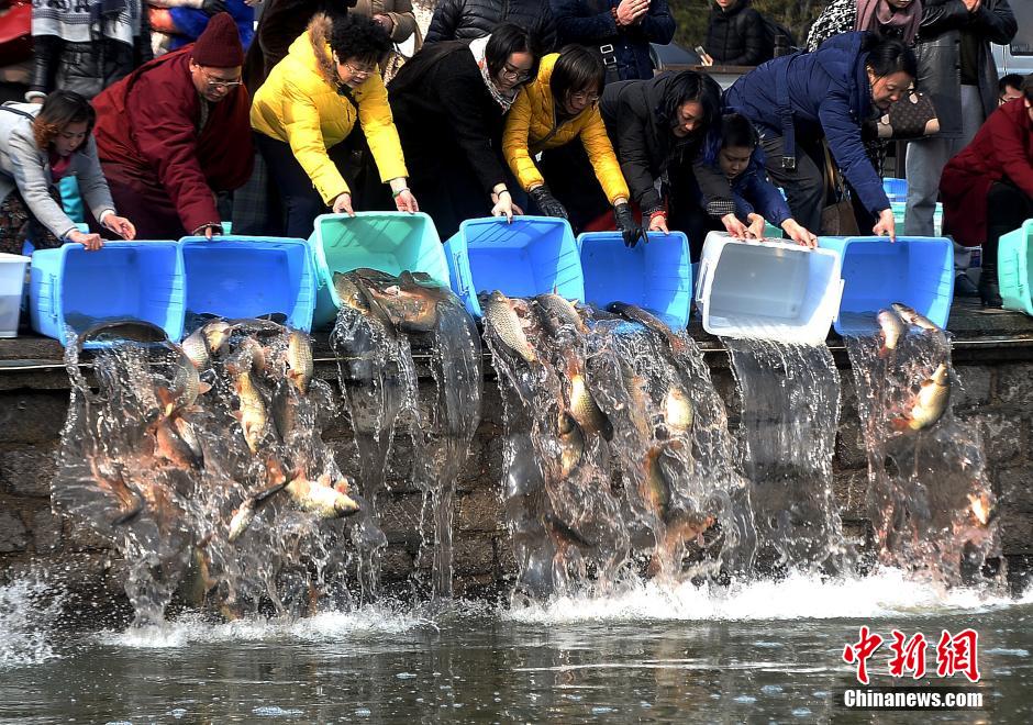 2016年2月22日,山東省濟(jì)南市,眾多市民來(lái)到大明湖南岸,以每斤4.5元的價(jià)格購(gòu)買鯉魚和鯽魚,集體將魚兒放生到大明湖,千余尾魚兒同時(shí)傾倒在湖中,場(chǎng)面頗為壯觀。