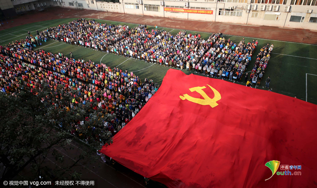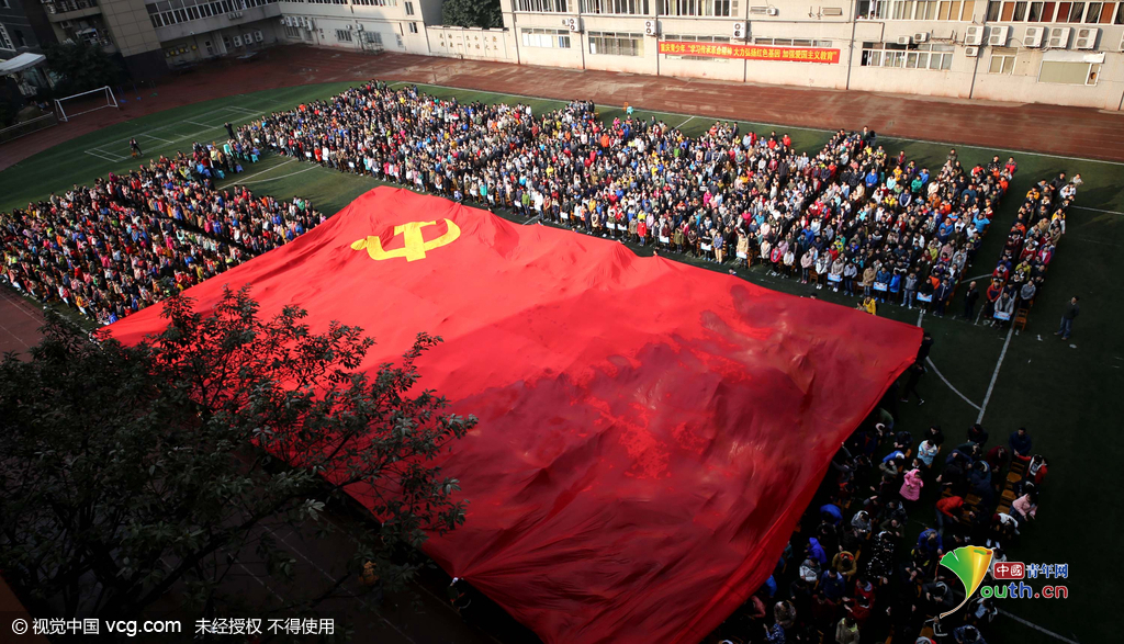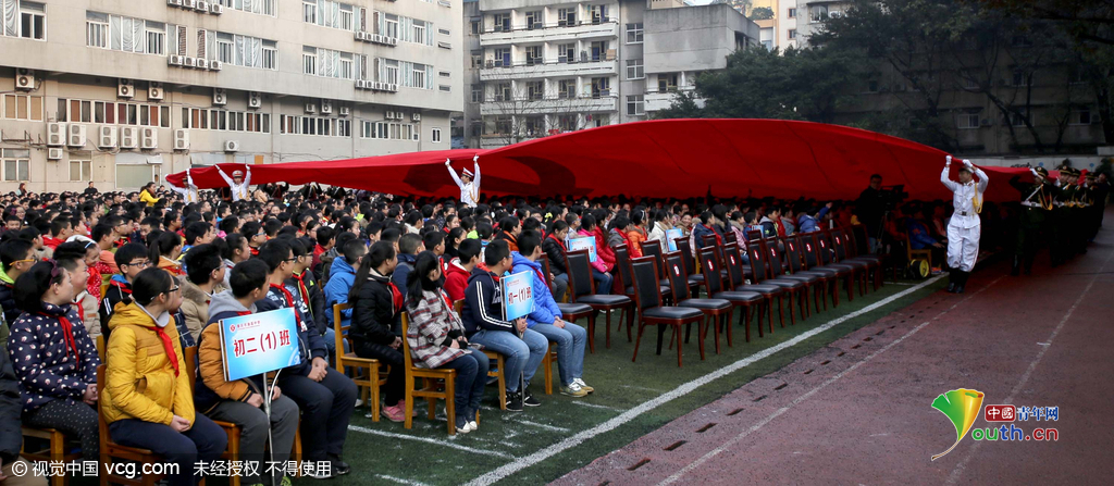 2016年02月24日,重慶市新區(qū),渝高中學(xué),開學(xué)典禮上同學(xué)們傳遞一面90米寬的巨大黨旗。開學(xué)第一課由聶榮臻元帥陳列館報(bào)告團(tuán)成員為同學(xué)們宣講老一輩無產(chǎn)階級(jí)革命家的豐功偉績(jī)。視覺中國(guó)