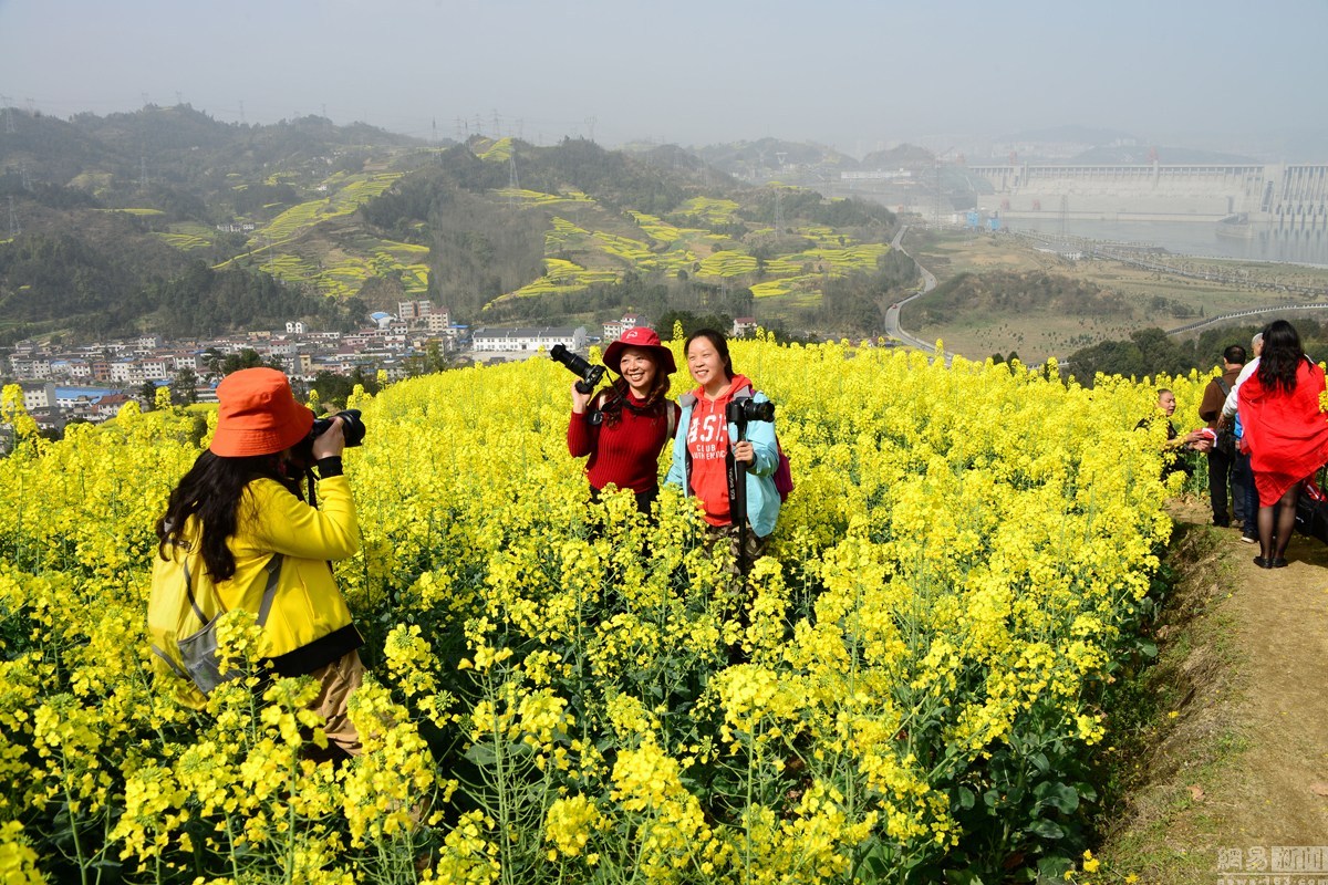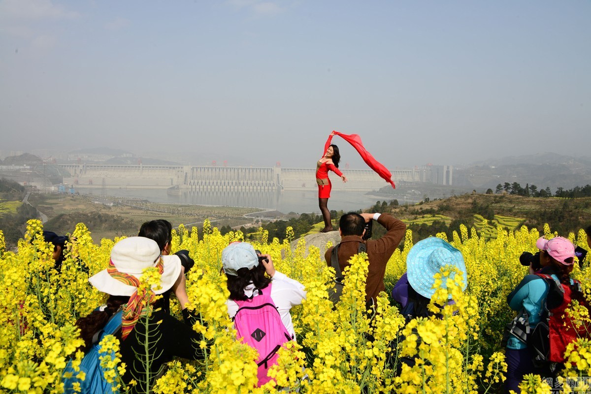 三峽大壩前賞花的大媽。