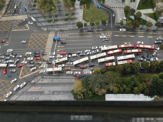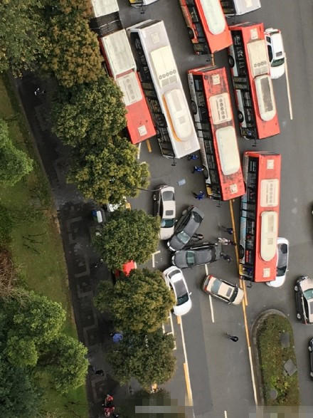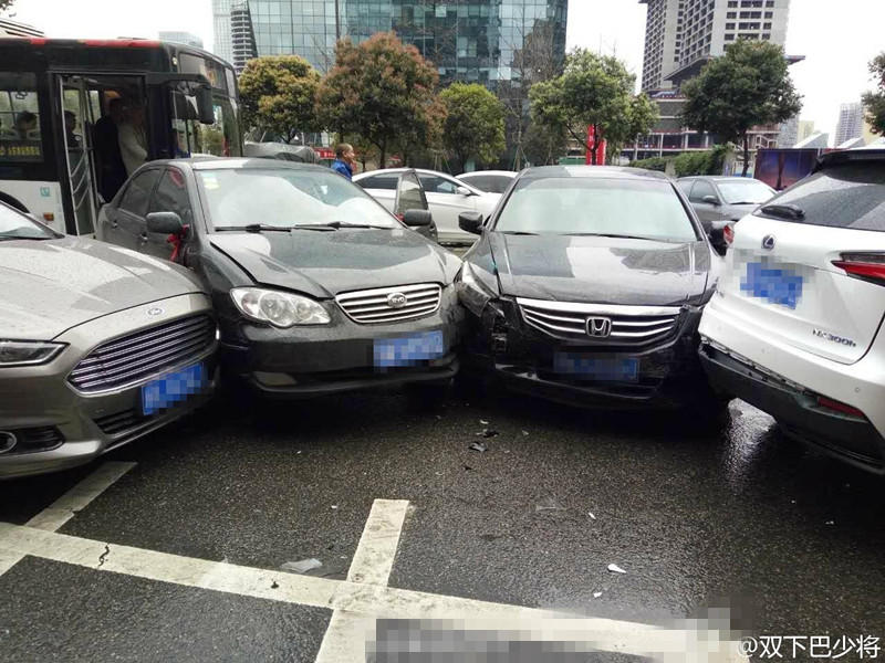 成都益州大道和交子大道大道路口發(fā)生車禍,4輛汽車撞擊在一起,造型別致。(圖文來源:微博網(wǎng)友)