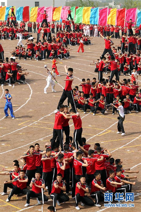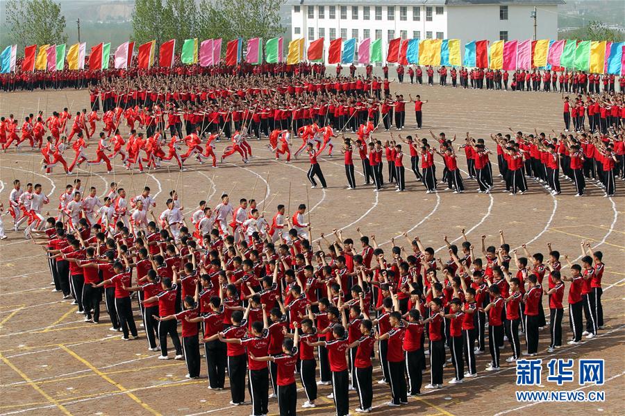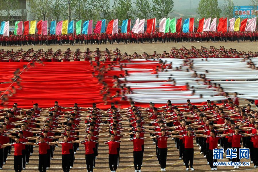 4月7日,在河南登封少林塔溝武術(shù)學(xué)校練功場,上課間操的學(xué)員進(jìn)行隊形變換。當(dāng)日,河南登封少林塔溝武術(shù)學(xué)校2016年“春訓(xùn)”拉開帷幕,2.6萬名學(xué)員同上陣,進(jìn)行隊形變換、十八般兵器、少林硬氣功、少林集體棍等多種功法演練?!按河?xùn)”是少林塔溝武術(shù)學(xué)校每年春季開展的一項強(qiáng)化訓(xùn)練活動,旨在提升學(xué)員的耐力和競技狀態(tài)。新華社發(fā)(牛書培 攝)