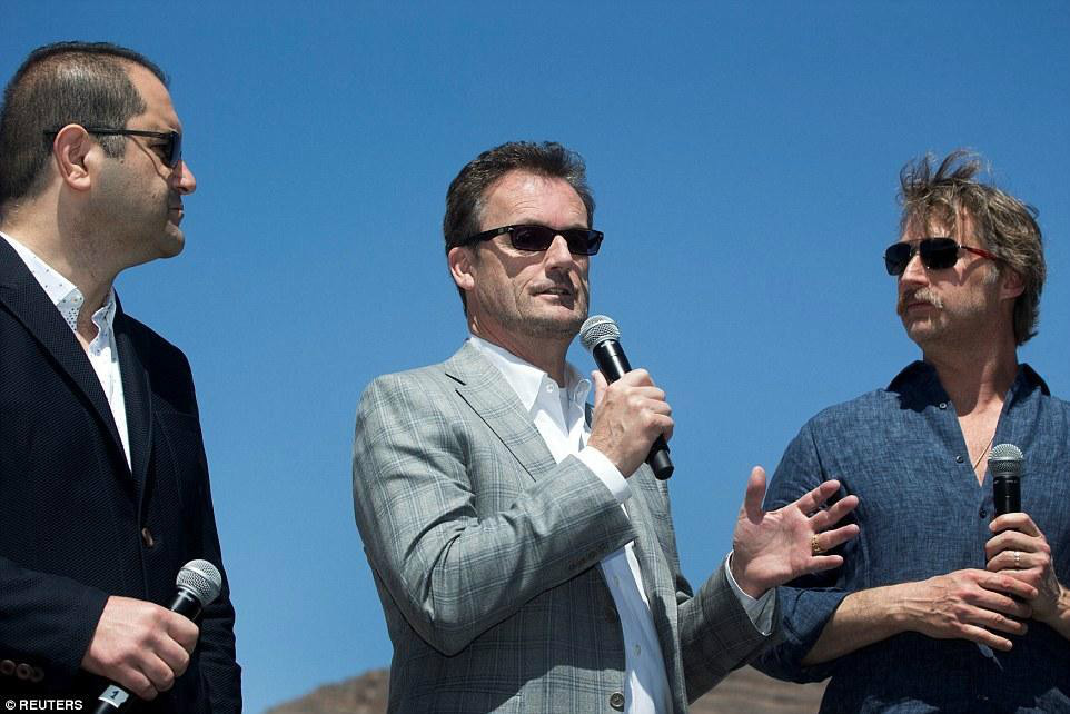 圖中間是Hyperloop One公司CEO羅布-勞埃德,左右兩邊分別是Hyperloop One公司創(chuàng)始人舍文-皮許瓦爾和布羅根-班布羅根。他們在北拉斯維加斯超級高鐵推進系統(tǒng)測試之后發(fā)表了講話。