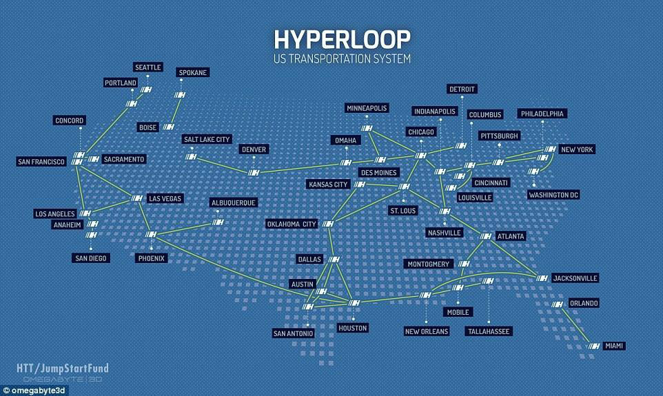 馬斯克在提出超級高鐵概念時曾說它是協(xié)和式超音速噴射客機、軌道炮和空氣球臺的交叉結(jié)合,圖為HTT公司想架設(shè)超級高鐵的地區(qū)路線圖。