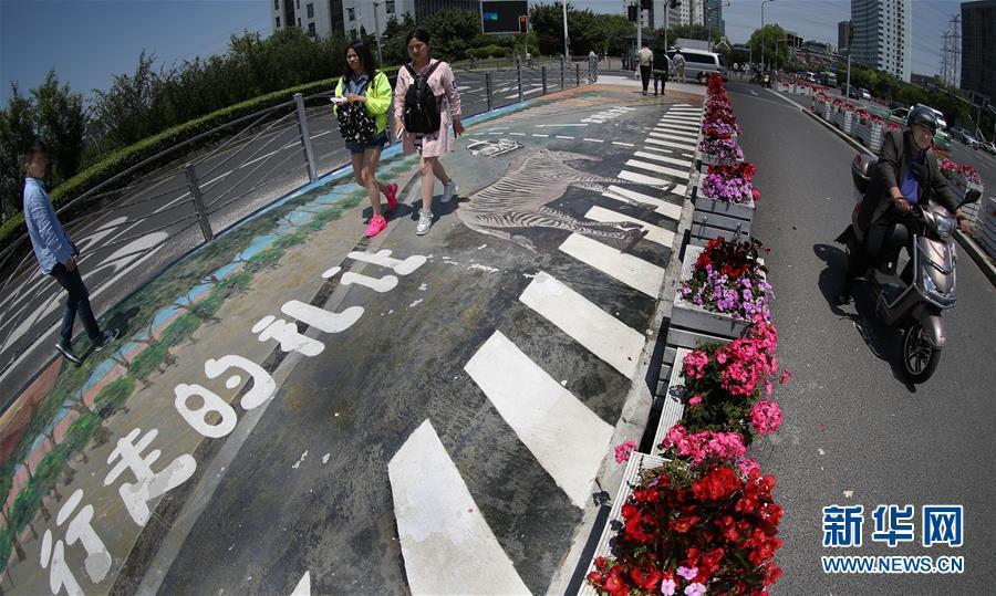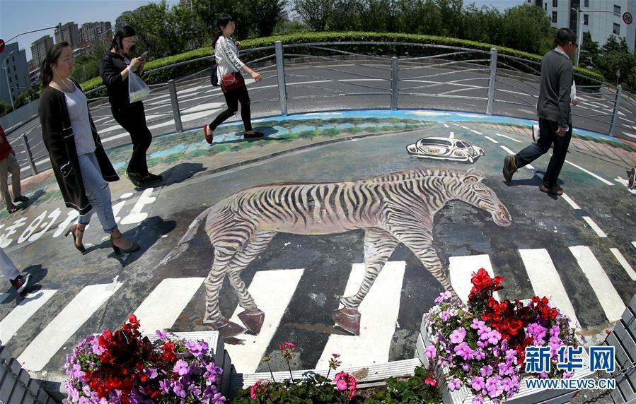 5月16日,行人從上海漕河涇開發(fā)區(qū)一處3D斑馬線上走過。近日,上海漕河涇開發(fā)區(qū)的一條人行橫道線變身一幅3D效果圖畫,還“植入”了宣傳行走禮讓的標(biāo)語,呼吁文明出行。 新華社記者 凡軍 攝 圖片來源:新華網(wǎng)