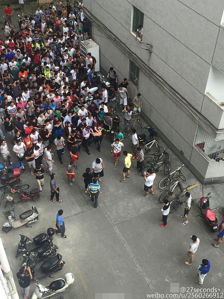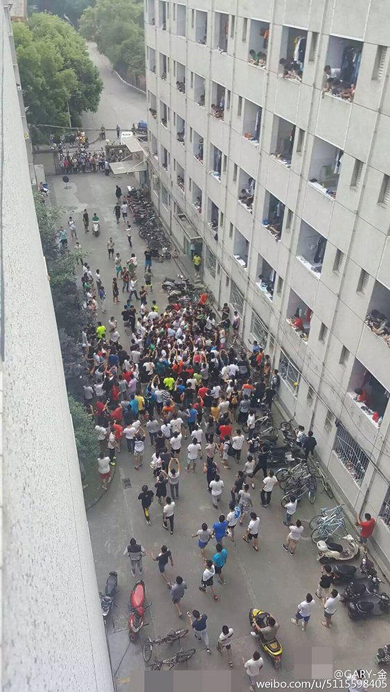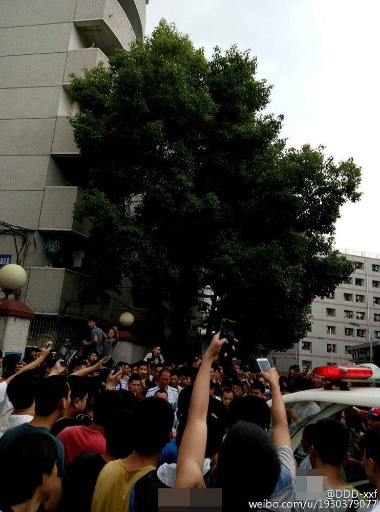 在小偷被攔下后,現(xiàn)場的喊聲驚動了更多路過的學(xué)生,不到半分鐘時間,兩棟樓內(nèi)的男生迅速跑下樓,現(xiàn)場近百名學(xué)生將小偷圍得水泄不通。