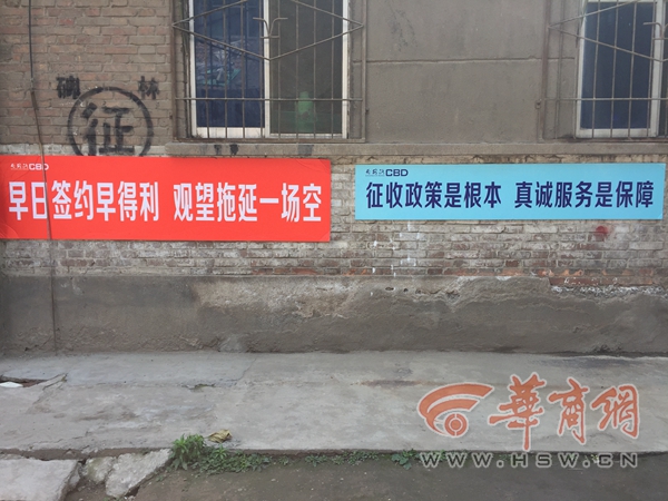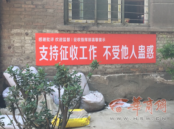 華商網(wǎng)訊 “支持征收工作、不做過街老鼠。”看到這樣的拆遷標(biāo)語,您會作何感想?近日,這樣的標(biāo)語出現(xiàn)在雁塔區(qū)糧食局的家屬院內(nèi),而這則標(biāo)語的懸掛者,則是紅會醫(yī)院西側(cè)棚戶區(qū)改造項目征收指揮部。對于為何懸掛這樣的標(biāo)語,該指揮部一位負責(zé)人稱,部分住戶為達個人目的煽動群眾,抵抗拆遷,而為提醒其他群眾不受蒙蔽、蠱惑,制作了這條橫幅。目前,標(biāo)語已經(jīng)被替換。